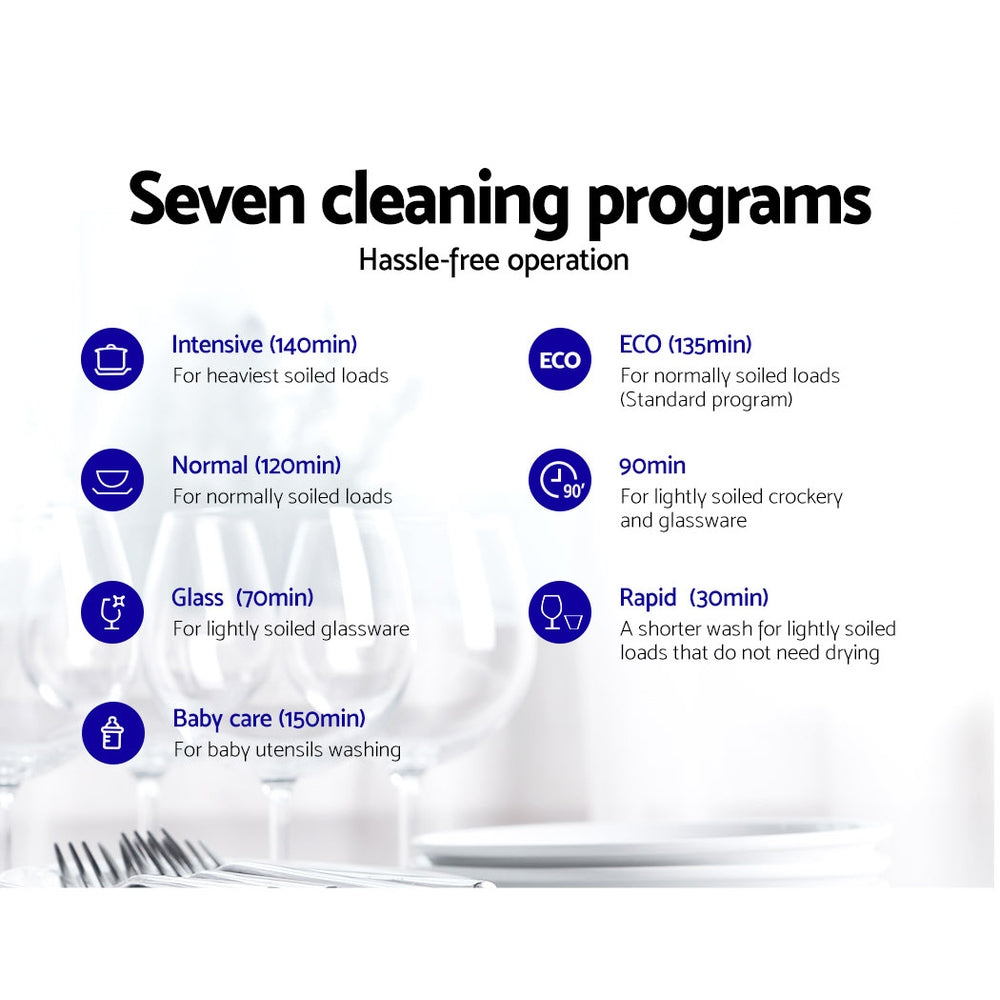 The quiet-operation Bench Top Dishwasher features seven cleaning programs, from intensive to rapid, and has delay start functions of between two and eight hours. The easy-to-use LED screen display easily guides you along with clear setting indicators for effortlessly dishwashing. Not least, it comes with all the accessories to accommodate your various kitchen, dining and cooking wares and you easily add in left-out dishes to the washing cycle.
