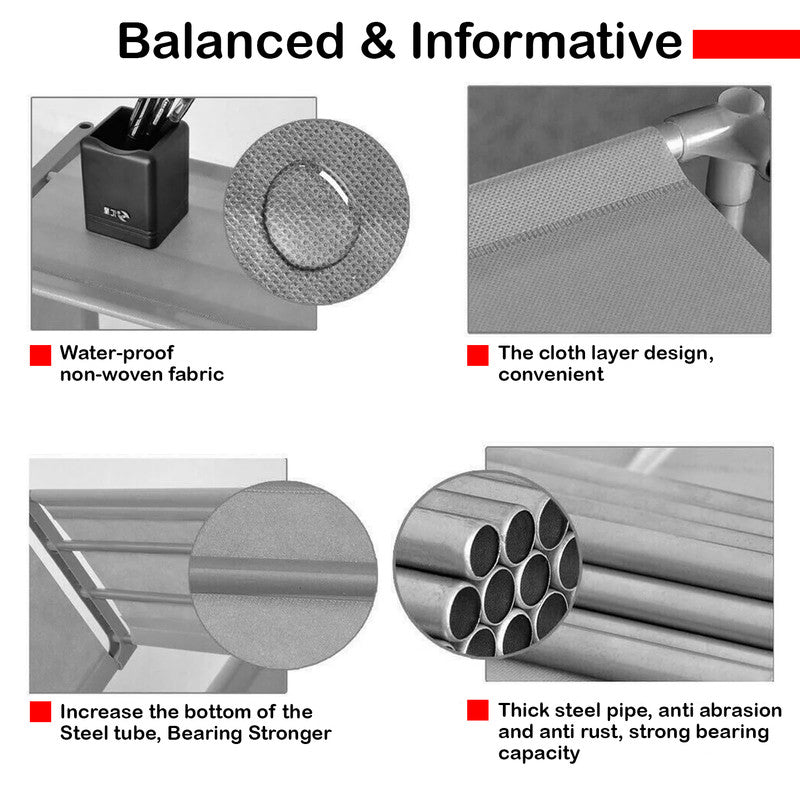 This lightweight, multi-functional bookshelf is ideal for any room – from bedrooms and living areas to home offices and entryways. It neatly stores books, school bags, plants, clothes, shoes, and more – making organisation simple and stylish. - With an easy, tool-free assembly, this rack provides a sturdy structure using metal tubes, reinforced ABS plastic, and non-woven fabric barriers that prevent items from shifting. The fabric is dustproof and waterproof, while the overall design is light enough to move and reconfigure anytime.