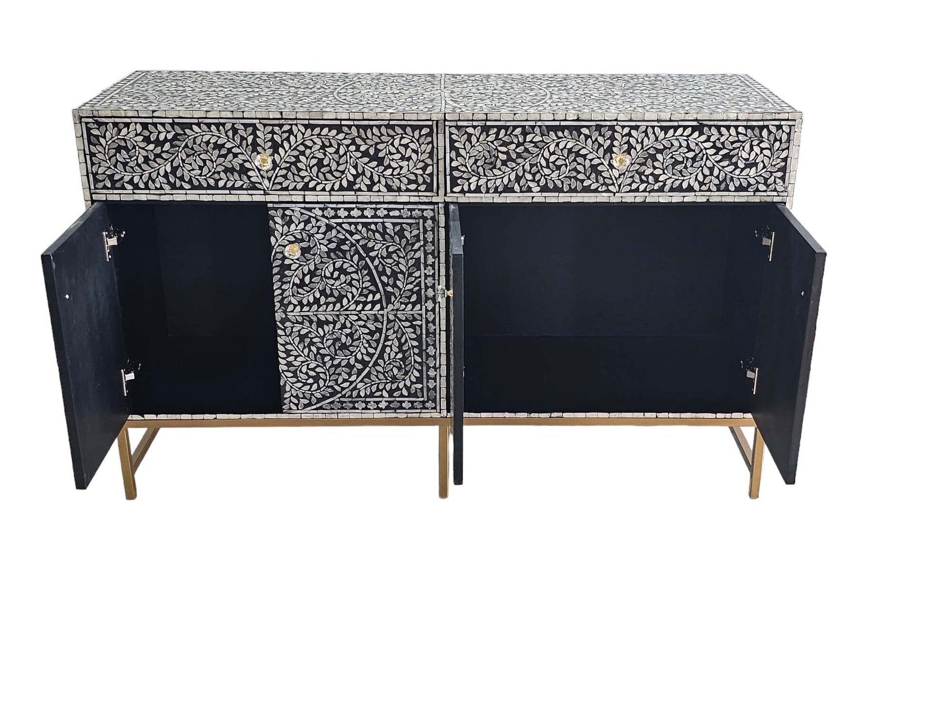 Elevate your space with the Grandiose Vine Mother of Pearl sideboard from our exquisite Mother of Pearl range. This console is a true statement piece, featuring a larger size and showcasing a striking vine pattern intricately inlaid with shimmering Mother of Pearl. The grandeur of this sideboard commands attention and adds a touch of opulence to any room. The meticulous craftsmanship and attention to detail are evident in every curve and line, creating a captivating visual display. With its generous surface area and ample storage capacity, this sideboard offers both functionality and breathtaking beauty. Experience the epitome of luxury with the Grandiose Vine Mother of Pearl sideboard.