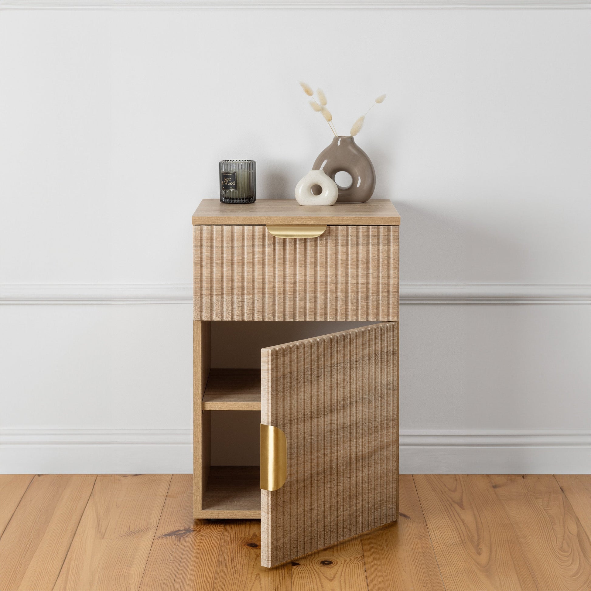 PORTO BEDSIDE TABLE - NATURAL OAK - FLUTED - PULL BRASS