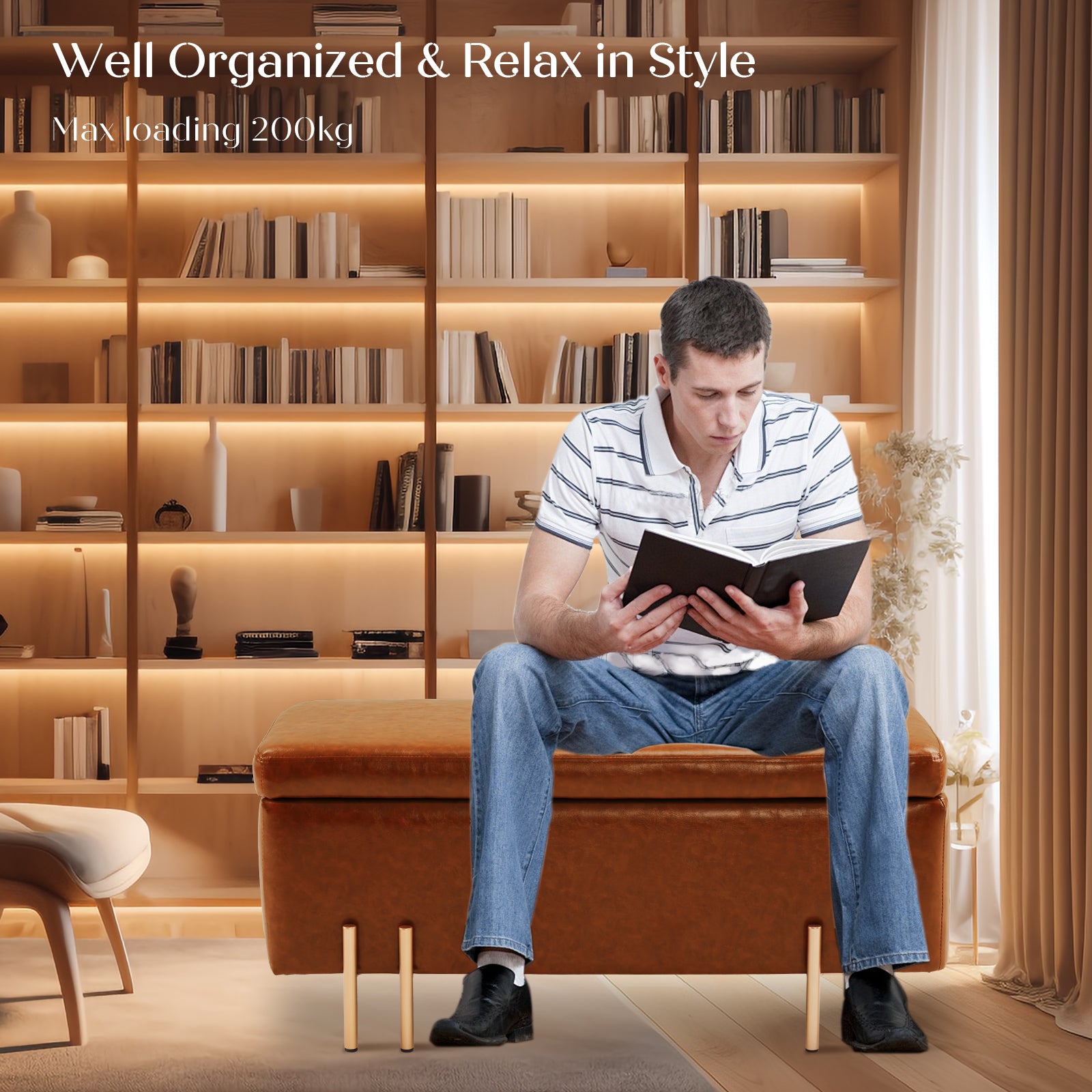 Supported by sleek metal legs, the ottoman brings contemporary charm with stability and durability. Lift the lid to reveal ample storage space for blankets, pillows, and more, effortlessly keeping your living area clutter-free.